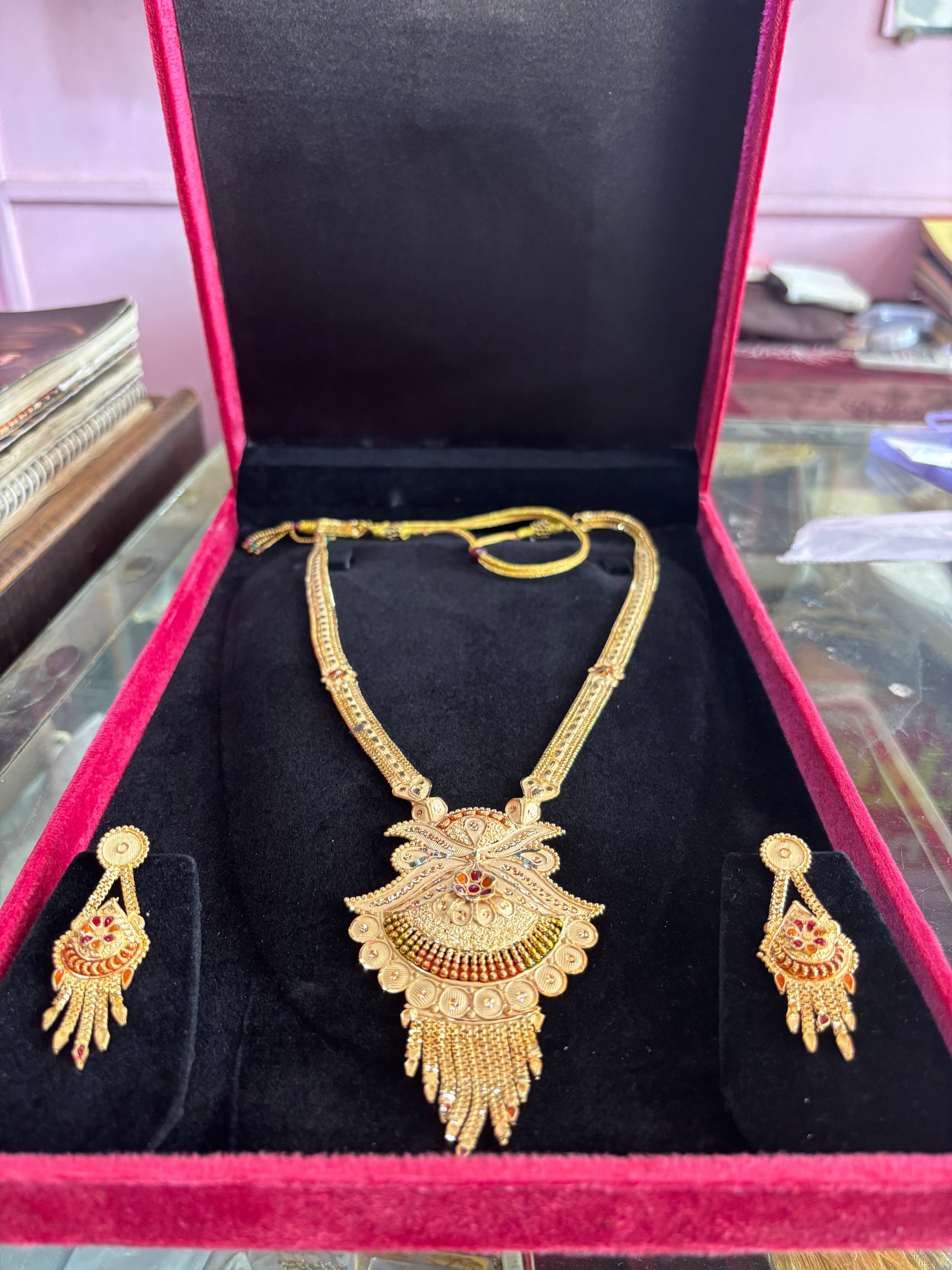 Elevate your style without breaking the bank! This stunning 1gm gold-plated artificial necklace is designed to give you that real gold look and feel—at a fraction of the price. Lightweight, elegant, and crafted with fine detail, it's perfect for daily wear, casual outings, or even special occasions. Whether you're dressing up for a party or just adding a golden glow to your everyday outfit, this necklace brings effortless charm to your jewelry collection.